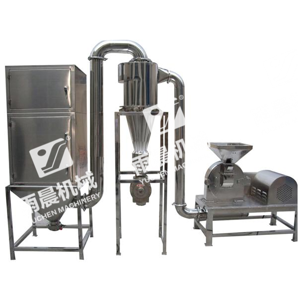 This machine is composed of crusher, cyclone separator, pulse dust box and fan, etc. The machine uses the relative motion between the movable tooth plate and the fixed tooth plate, so that the crushed material is crushed by the tooth impact, friction and the impact between the material, the crushed material by the rotating centrifugal force and the gravity of the fan, into the cyclone separator, and then through the fan discharge, the dust into the pulse dust box, through the filter cylinder and recovery, the finness of the grinding is adjusted by the screen. The whole machine is designed according to GMP standard, all made of stainless steel material, no dust flying in the production process.