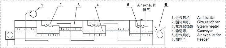 DW系列帶式干燥機(jī)料斗中的物料由加料器均勻地鋪在網(wǎng)帶上,網(wǎng)帶采用12-60目不銹鋼絲網(wǎng),由傳動(dòng)裝置拖動(dòng)在干燥機(jī)內(nèi)移動(dòng)。干燥段由若干單元組成,每一單元熱風(fēng)獨(dú)立循環(huán),其中部分尾氣由專門(mén)排濕風(fēng)機(jī)排出,每一單元排出氣量均有調(diào)節(jié)閥控制。在上循環(huán)單元中,循環(huán)風(fēng)機(jī)出來(lái)的風(fēng)由側(cè)面風(fēng)道進(jìn)入單元下腔,氣流向上通過(guò)換熱器加熱,并經(jīng)分配器分配后。成噴射流吹向網(wǎng)帶,穿過(guò)物料后進(jìn)入上腔。干燥過(guò)程是熱風(fēng)氣流穿過(guò)物料層,完成熱量與質(zhì)量傳達(dá)過(guò)程。上腔由風(fēng)管與風(fēng)機(jī)入口相連,大部分氣流體循環(huán),一部分溫度較低含濕量較大的氣體作為廢氣經(jīng)排濕管、調(diào)節(jié)閥、跳濕風(fēng)機(jī)排出。下循環(huán)單元中,循環(huán)風(fēng)機(jī)出來(lái)的風(fēng)先進(jìn)入上腔,向下經(jīng)換熱器加熱,穿過(guò)物料層進(jìn)入下腔,下腔由側(cè)面風(fēng)道及回風(fēng)管與風(fēng)機(jī)入口相連,大部分氣體循環(huán),一部分排出。上下循環(huán)單元根據(jù)用戶需要可靈活配備,單元數(shù)量亦可根據(jù)需要選取。