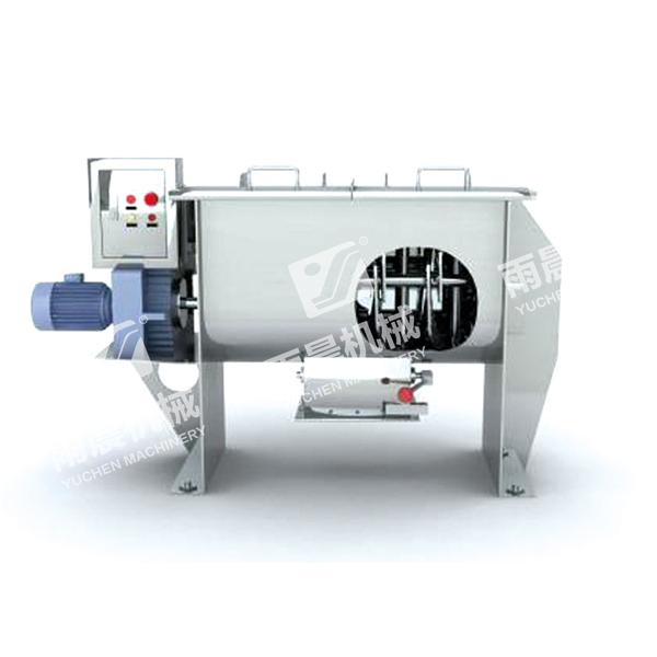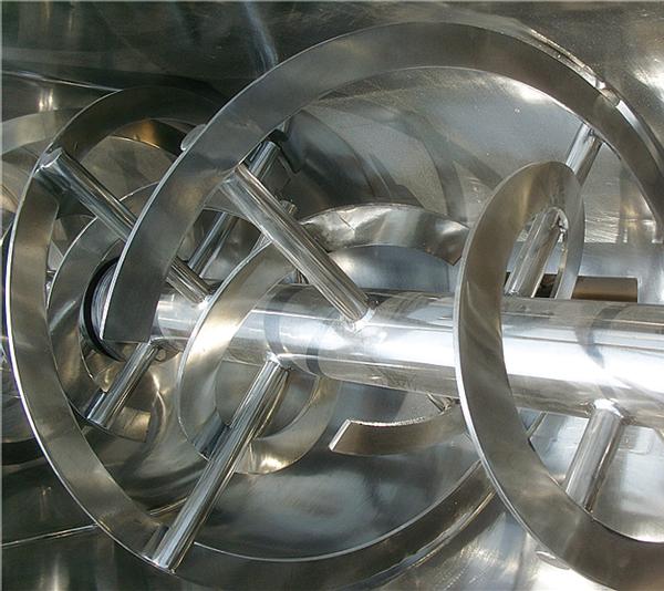 該機由混合槽、螺旋攪拌葉片和傳動部件等組合合成,螺旋葉片一般做成二層,外層螺旋將物料從兩側(cè)向中央?yún)R集,內(nèi)層螺旋將物料從中央向兩側(cè)分流,使物料在混合槽內(nèi)形成對流混合,從而達到高均勻度混合。